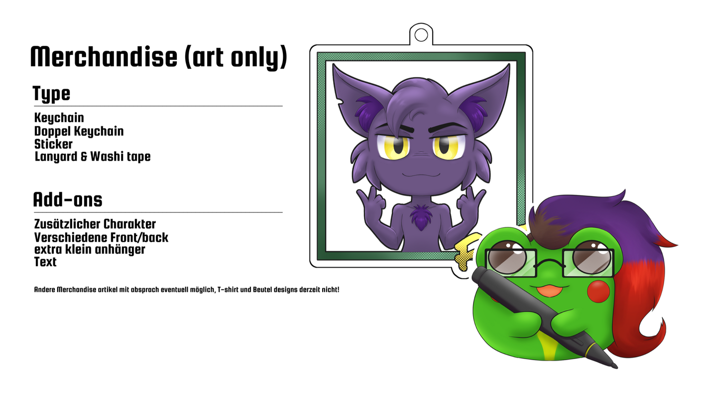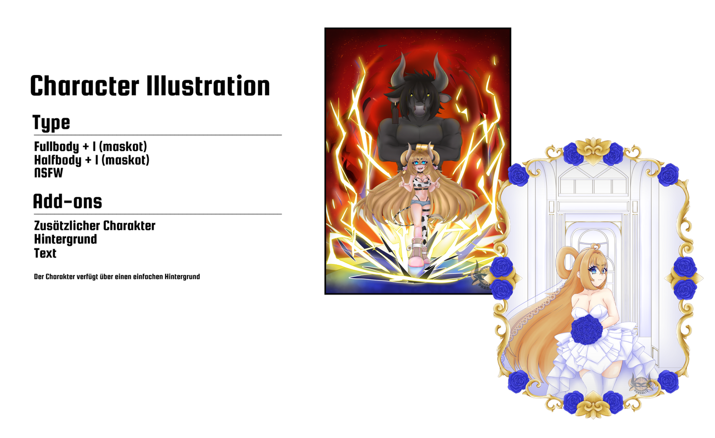 ZahlungenAlle Preise sind in EuroDie Zahlung muss Vollständig im Voraus erfolgen.Die Provision beginnt erst, nachdem ich die Vollständige Zahlung erhalten habe.Meine Aufträge sind in Lvl aufgeteiltLvl 1: +50% (Promo Material, Streaming, Vtuber, Youtube benutzung, Banner und co.)